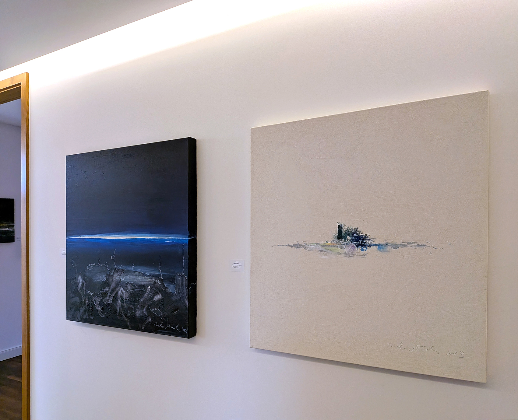Ausstellungsansicht - Blaue Sonne / Grosses Versteck, je 100 x 100 cm